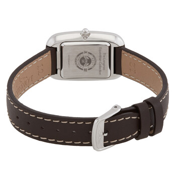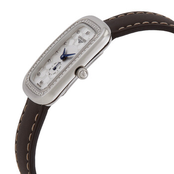 Silver-tone stainless steel case with a brown leather strap. Fixed silver-tone diamond bezel. Silver-tone dial with blue hands and diamond hour markers. Dial Type: Analog. Swiss Quartz quartz movement. Scratch resistant sapphire crystal. Pull / push crown. Solid case back. Rectangle case shape, case size: 22 mm, case thickness: 6.2 mm. Band width: 12 mm, band length: 7 inches. Tang clasp. Water resistant at 30 meters / 100 feet. Functions: hour, minute, second. Additional Info: hours, minutes, small seconds. Equestrian Series. Luxury watch style. Longines Equestrian Diamond Silver-tone Dial Ladies Watch L61410772.