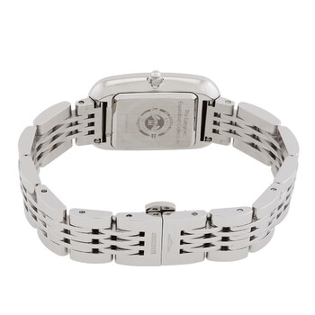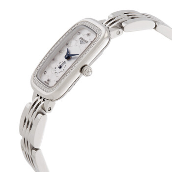 Silver-tone stainless steel case and bracelet. Fixed silver-tone diamond bezel. Silver-tone dial with blue hands and diamond hour markers. Dial Type: Analog. Swiss Quartz quartz movement. Scratch resistant sapphire crystal. Pull / push crown. Solid case back. Rectangle case shape, case size: 22 mm, case thickness: 6 mm. Band width: 12 mm. Deployment with push button release clasp. Water resistant at 30 meters / 100 feet. Functions: hour, minute, second. Additional Info: hours, minutes, small seconds. Equestrian Series. Luxury watch style. Longines Equestrian Quartz Diamond Silver Dial Ladies Watch L6.141.0.77.6.