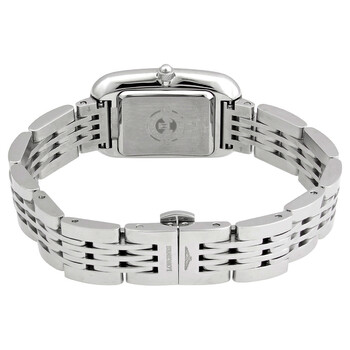Stainless steel case with a stainless steel bracelet. Fixed stainless steel bezel. Silver dial with blue hands and diamond hour markers. Dial Type: Analog. Small seconds sub-dial. Quartz movement. Scratch resistant sapphire crystal. Pull / push crown. Solid case back. Rectangle case shape. Case dimensions: 22 mm x 32 mm. Band width: 12 mm. Fold over clasp. Water resistant at 30 meters / 100 feet. Functions: hour, minute, second. Equestrian Series. Dress watch style. Watch label: Swiss Made. Longines Equestrian Quartz Diamond Silver Dial Ladies Watch L61414776.