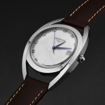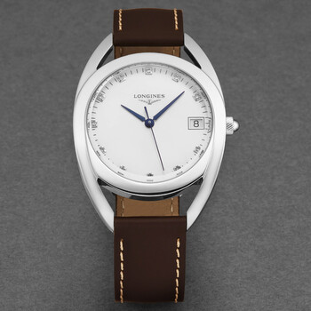 Silver-tone stainless steel case with a brown leather strap. Fixed silver-tone stainless steel bezel. White dial with blue hands and diamond hour markers. Minute markers around the outer rim. Dial Type: Analog. Date display at the 3 o'clock position. Longines Calibre L157 quartz movement. Scratch resistant sapphire crystal. Round case shape, case size: 34 mm. Band width: 16 mm. Water resistant at 30 meters / 100 feet. Functions: date, hour, minute, second, battery eol indicator. Additional Info: original box, international warranty card, manual (complete accessories). Equestrian Series. Luxury watch style. Watch label: Swiss Made. Longines Equestrian Quartz Diamond White Dial Ladies Watch L6.138.4.87.2.
