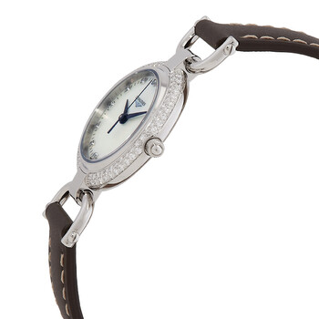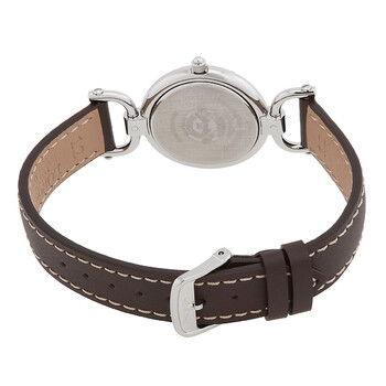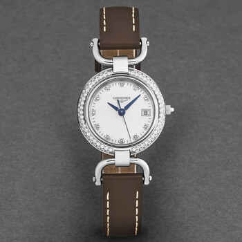 Silver-tone stainless steel case with a brown leather strap. Fixed silver-tone bezel with diamond set. White mother of pearl dial with blue hands and diamond hour markers. Minute markers around the outer rim. Dial Type: Analog. Date display at the 3 o'clock position. Longines Calibre L152 quartz movement. Scratch resistant sapphire crystal. Solid case back. Round case shape, case size: 26 mm. Band width: 12 mm. Water resistant at 30 meters / 100 feet. Functions: date, hour, minute, second. Equestrian Series. Dress watch style. Watch label: Swiss Made. Longines Equestrian Quartz Diamond White Mother of Pearl Dial Ladies Watch L6.130.0.89.2.