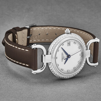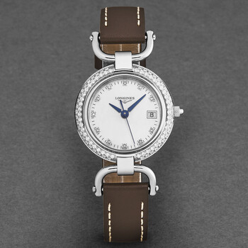 Stainless steel case with a brown calfskin leather strap. Fixed bezel. Mother of pearl dial. Dial Type: Analog. Date display at the 3 o'clock position. Longines Calibre L152 quartz movement. Scratch resistant sapphire crystal. Pull / push crown. Solid case back. Round case shape, case size: 30 mm. Band width: 14 mm. Water resistant at 30 meters / 100 feet. Functions: date, hour, minute, second. Equestrian Series. Watch label: Swiss Made. Longines Equestrian Quartz Ladies Watch L6.131.0.89.2.