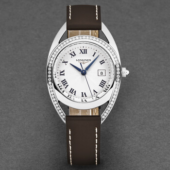 Silver-tone stainless steel case with a brown leather strap. Diamond set bezel. Silver dial with blue hands and Roman numeral hour markers. Minute markers around the outer rim. Dial Type: Analog. Date display at the 3 o'clock position. Longines Calibre L152 quartz movement. Scratch resistant sapphire crystal. Solid case back. Oval case shape, case size: 30 mm. Water resistant at 30 meters / 100 feet. Functions: date, hour, minute, second. Additional Info: bezel set with 61 diamonds (0.359 carats). Equestrian Series. Dress watch style. Watch label: Swiss Made. Longines Equestrian Quartz Silver Dial Ladies Watch L6.137.0.71.2.