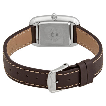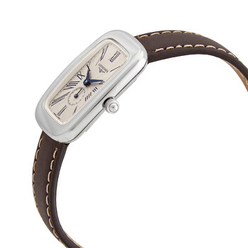 Stainless steel case with a brown (calfskin) leather strap. Fixed stainless steel bezel. Silver dial with blue hands and Roman numeral hour markers. Minute markers around the outer rim. Dial Type: Analog. Quartz movement. Scratch resistant sapphire crystal. Pull / push crown. Solid case back. Cushion case shape. Case dimensions: 22 mm x 32 mm. Band width: 14 mm. Tang clasp. Water resistant at 30 meters / 100 feet. Functions: hour, minute, second. Equestrian Series. Dress watch style. Watch label: Swiss Made. Longines Equestrian Quartz Silver Dial Unisex Watch L61414712.