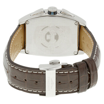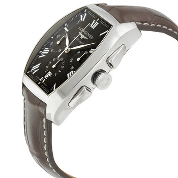 Stainless steel case with a brown leather strap. Fixed stainless steel bezel. Black dial with silver-tone hands and Roman numeral hour markers. Minute markers around the outer rim. Dial Type: Analog. Date display at the 6 o'clock position. Chronograph - three sub-dials displaying: 60 second, 30 minute and 12 hour. Automatic movement. Scratch resistant sapphire crystal. Solid case back. Case dimensions: 35 mm x 40 mm. Case thickness: 12.5 mm. Tonneau case shape. Water resistant at 30 meters / 100 feet. Functions: chronograph, date, hour, minute, second. Additional Info: suitable for splashing, light rain; unsuitable for swimming or diving. Casual watch style. Watch label: Swiss Made. Longines Evidenza Chronograph Automatic Ladies Watch L26434514.