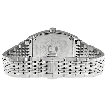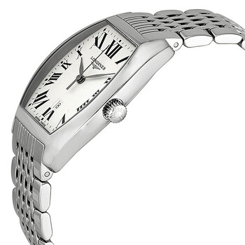 Stainless steel case with a stainless steel bracelet. Fixed stainless steel bezel. Silver white dial with silver-tone hands and Roman numeral hour markers. Minute markers around the outer rim. Dial Type: Analog. Date display above the 6 o'clock position. Quartz movement. Scratch resistant sapphire crystal. Solid case back. Case dimensions: 36.0 mm x 26.0 mm. Case thickness: 7.5 mm. Tonneau case shape. Deployment clasp with push button release. Water resistant at 30 meters / 100 feet. Casual watch style. Longines Evidenza Silver White Dial Stainless Steel Ladies Watch L21554716.