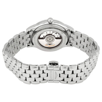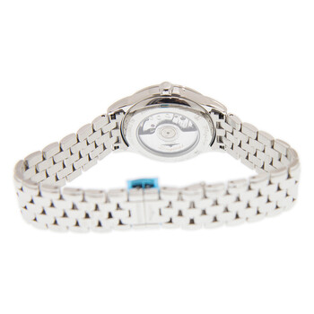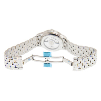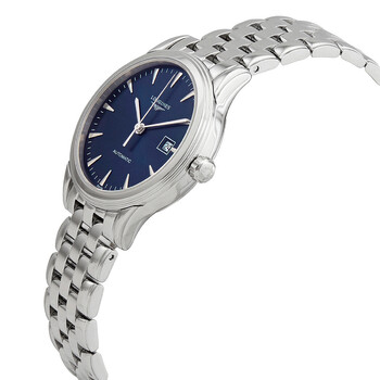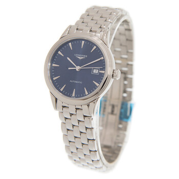 Stainless steel case with a stainless steel bracelet. Fixed stainless steel bezel. Blue dial with silver-tone sword-shaped hands and index hour markers. Minute markers around the outer rim. Dial Type: Analog. Date display at the 3 o'clock position. Longines calibre L595/592 automatic movement, based upon ETA 2000-1, containing 20 Jewels, bitting at 28800 vph, and has a power reserve of approximately 40 hours. Scratch resistant sapphire crystal. Pull / push crown. Transparent case back. Round case shape. Case size: 30 mm. Case thickness: 8.72 mm. Band width: 15 mm. Butterfly clasp. Water resistant at 30 meters / 100 feet. Functions: date, hour, minute, second. Flagship Series. Luxury watch style. Watch label: Swiss Made. Longines Flagship Automatic Blue Dial Ladies Watch L4.374.4.92.6.