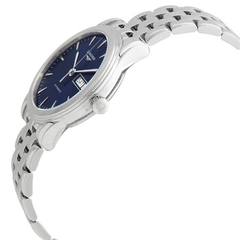 Silver-tone stainless steel case with a polished stainless steel bracelet. Fixed stainless steel bezel. Blue dial with silver-tone hands and index hour markers. Dial Type: Analog. Day of the week and date display at the 3 o'clock position. Caliber L636.5 (base ETA 2892/A2) automatic movement. Scratch resistant sapphire crystal. Pull / push crown. Transparent case back. Round case shape, case size: 35.6 mm, case thickness: 9.8 mm. Push button folding clasp. Water resistant at 30 meters / 99 feet. Functions: date, day, hour, minute, second. Flagship Series. Dress watch style. Watch label: Swiss Made. Longines Flagship Automatic Blue Dial Ladies Watch L47994926.