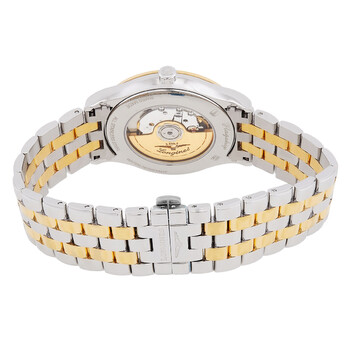 Yellow gold & stainless steel case with a two-tone (silver-tone and yellow gold-tone) yellow gold plated & stainless steel bracelet. Fixed yellow gold yellow gold plated bezel. Champagne dial with yellow gold hands and diamond hour markers. Minute markers around the outer rim. Dial Type: Analog. Date display at the 3 o'clock position. L888 automatic movement with a 72-hour power reserve. Scratch resistant sapphire crystal. Pull / push crown. Transparent see through case back. Round case shape, case size: 40 mm, case thickness: 8.70 mm. Band width: 21.00 mm. Deployment with push button release clasp. Water resistant at 30 meters / 100 feet. Functions: date, hour, minute, second. Flagship Series. Dress watch style. Watch label: Swiss Made. Longines Flagship Automatic Diamond Champagne Dial Watch L49843377.