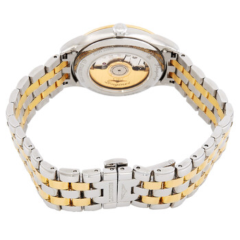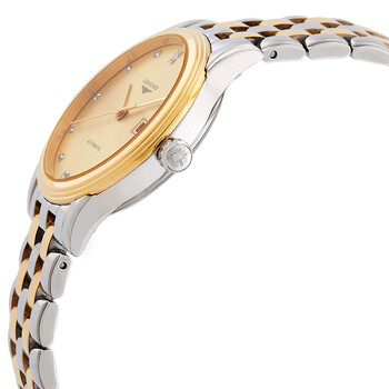 Stainless steel & plated yellow gold case with a polished stainless steel & plated yellow gold bracelet. Fixed yellow gold bezel. Gold dial with yellow gold hands and diamond hour markers. Dial Type: Analog. Date display at the 3 o'clock position. Caliber L595/592 automatic movement. Scratch resistant sapphire crystal. Pull / push crown. Transparent case back. Round case shape, case size: 30 mm. Hidden folding clasp. Water resistant at 30 meters / 100 feet. Functions: date, hour, minute, second. Flagship Series. Dress watch style. Watch label: Swiss Made. Longines Flagship Automatic Diamond Gold Dial Ladies Watch L4.374.3.37.7.