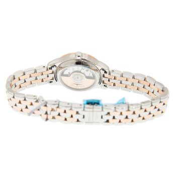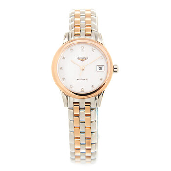 Two-tone (silver-tone and rose gold-tone) stainless steel case and bracelet. Fixed rose gold-tone stainless steel bezel. White dial with rose gold-tone hands and diamond hour markers. Dial Type: Analog. Date display at the 3 o'clock position. Caliber L619 automatic movement with a 42-hour power reserve. Scratch resistant sapphire crystal. Pull / push crown. Transparent see through case back. Round case shape, case size: 38.5 mm, case thickness: 8 mm. Band width: 20 mm. Hidden clasp. Water resistant at 30 meters / 100 feet. Functions: date, hour, minute, second. Flagship Series. Dress watch style. Watch label: Swiss Made. Longines Flagship Automatic Diamond White Dial Men's Watch L48743997.