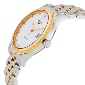 Two-tone (silver-tone and gold-tone) stainless steel case and bracelet. Fixed gold-tone stainless steel bezel. White dial with gold-tone hands and diamond hour markers. Dial Type: Analog. Date display at the 3 o'clock position. L888 automatic movement. Scratch resistant sapphire crystal. Pull / push crown. Transparent see through case back. Round case shape, case size: 40 mm, case thickness: 8.7 mm. Folding clasp. Water resistant at 30 meters / 100 feet. Functions: date, hour, minute, second. Flagship Series. Dress watch style. Watch label: Swiss Made. Longines Flagship Automatic Diamond White Dial Men's Watch L49843277.