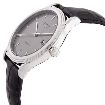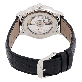 Silver-tone stainless steel case with a black leather strap. Fixed silver-tone stainless steel bezel. Silver-tone dial with silver-tone hands and index hour markers. Minute markers around the outer rim. Dial Type: Analog. Date display at the 3 o'clock position. Longines Calibre L888 Automatic movement, based upon ETA A31.L11, containing 21 Jewels, bitting at 25200 vph, and has a power reserve of approximately 64 hours. Scratch resistant sapphire crystal. Transparent case back. Round case shape, case size: 40 mm, case thickness: 8.7 mm. Band width: 21 mm. Tang clasp. Water resistant at 30 meters / 100 feet. Functions: date, hour, minute, second. Flagship Series. Casual watch style. Watch label: Swiss Made. Longines Flagship Automatic Silver Dial Men's Watch L4.984.4.72.2.