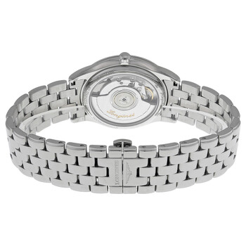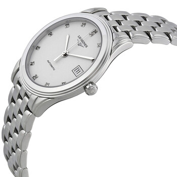 Stainless steel case with a stainless steel bracelet. Fixed smooth stainless steel bezel. White dial with silver-tone sword-shaped hands and diamond hour markers. Dial Type: Analog. Date display at the 3 o'clock position. Longines calibre L619 automatic movement, based upon ETA 2892-A2, containing 21 Jewels, bitting at 28800 vph, and has a power reserve of approximately 42 hours. Scratch resistant sapphire crystal. Pull / push crown. Transparent case back. Round case shape. Case size: 35.6 mm. Case thickness: 7 mm. Band width: 17 mm. Band length: 7 inches. Hidden fold over clasp. Water resistant at 30 meters / 100 feet. Functions: date, hour, minute, second. Flagship Series. Dress watch style. Watch label: Swiss. Item Variations: L4 774 4 27 6, L4-774-4-27-6, L4/774/4/27/6, L47744276. Longines Flagship Automatic White Dial Men's Watch L4.774.4.27.6.