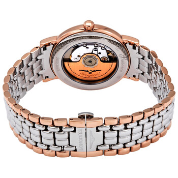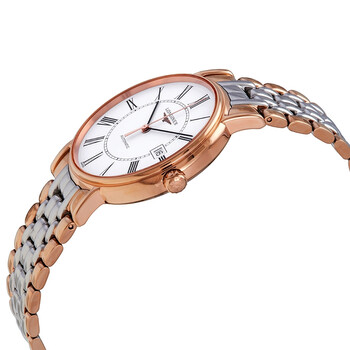 Stainless steel case with a two-tone (silver-tone and rose gold PVD) stainless steel bracelet. Fixed rose gold PVD bezel. White dial with black hands and Roman numeral hour markers. Minute markers around an inner ring. Dial Type: Analog. Date display at the 3 o'clock position. Longines calibre L619/888 automatic movement, based upon ETA 2892, containing 21 Jewels, bitting at 25200 vph, and has a power reserve of approximately 64 hours. Scratch resistant sapphire crystal. Pull / push crown. Transparent case back. Round case shape. Case size: 38 mm. Band width: 20 mm. Fold over clasp with a push button release. Water resistant at 30 meters / 100 feet. Functions: date, hour, minute, second. Additional Info: dial set with 13 wesselton vs diamonds, for a total of 0.034 carats. Flagship Series. Luxury watch style. Watch label: Swiss Made. Longines Flagship Automatic White Dial Two-tone Men's Watch L49211117.