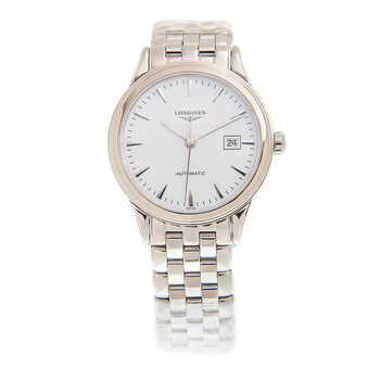 Silver-tone stainless steel case with a silver-tone stainless steel bracelet. Fixed silver-tone stainless steel bezel. White dial with silver-tone sword-shaped hands and index hour markers. Minute markers around the outer rim. Dial Type: Analog. Date display at the 3 o'clock position. Longines Calibre L595/592 Automatic movement, based upon ETA 2000-1, containing 20 Jewels, bitting at 28800 vph, and has a power reserve of approximately 40 hours. Scratch resistant sapphire crystal. Pull / push crown. Transparent case back. Round case shape, case size: 30 mm. Band width: 15 mm. Deployment with push button release clasp. Water resistant at 30 meters / 100 feet. Functions: date, hour, minute, second. Additional Info: original box, international warranty card, manual (complete accessories). Flagship Series. Luxury watch style. Watch label: Swiss Made. Item Variations: L43744126. Longines Flagship Automatic White Dial Unisex Watch L4.374.4.12.6.