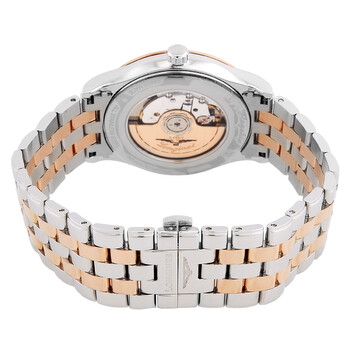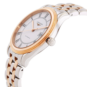 Rose gold plated & stainless steel case with a two-tone (silver-tone and rose gold-tone) rose gold plated & stainless steel bracelet. Fixed rose gold-tone plated stainless steel bezel. White dial with rose gold hands and Roman numeral hour markers. Minute scale around the inner rim. Dial Type: Analog. Date display at the 3 o'clock position. Longines Calibre L888 Automatic movement, based upon ETA A31.L11, containing 21 Jewels, bitting at 25200 vph, and has a power reserve of approximately 64 hours. Scratch resistant sapphire crystal. Transparent case back. Round case shape, case size: 40 mm, case thickness: 8.7 mm. Band width: 21 mm. Deployment with push button and foldover clasp. Water resistant at 30 meters / 100 feet. Functions: date, hour, minute, second. Flagship Series. Casual watch style. Watch label: Swiss Made. Longines Flagship Automatic White Dial Watch L4.984.3.91.7.