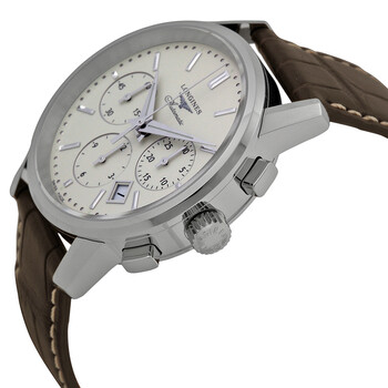 Stainless steel case with a brown leather strap. Fixed stainless steel bezel. Silver dial with silver-tone hands and index hour markers. Minute markers around the outer rim. Dial Type: Analog. Date display between 4 and 5 o'clock position. Chronograph - three sub-dials displaying: 60 second, 30 minute and 12 hour. Longines calibre L688 automatic movement with a 54-hour power reserve. Scratch resistant sapphire crystal. Pull / push crown. Transparent case back. Case size: 40 mm. Case thickness: 14 mm. Round case shape. Band width: 20 mm. Tang clasp. Water resistant at 30 meters / 100 feet. Functions: chronograph, column wheel, date, hour, minute, small second. Dress watch style. Watch label: Swiss Made. Item Variations: L2 749 4 72 2, L2-749-4-72-2, L2/749/4/72/2, L27494722. Longines Flagship Heritage Automatic Chronograph Men's Watch L27494722.