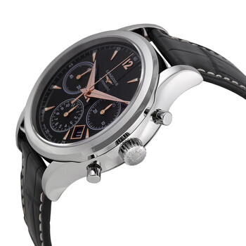 Stainless steel case with a black leather strap with contrast stiching. Fixed stainless steel bezel. Black dial with rose gold-tone hands and index hour markers. Arabic numerals mark the 12 o'clock position. Minute markers around the outer rim. Date display between the 4 and 5 o'clock positions. Chronograph - three sub-dials displaying: 60 seconds, 30 minutes and 12 hours. Automatic movement with a 54-hour power reserve. Scratch resistant sapphire crystal. Screw down crown. Skeleton case back. Case diameter: 41 mm. Case thickness: 14.4 mm. Tang clasp. Water resistant at 30 meters / 100 feet. Longines Flagship Heritage Chronograph Men's Watch 27504560.