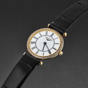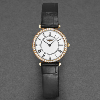 18kt rose gold case with a black leather strap. Fixed bezel. White dial with black hands and Roman numeral hour markers. Dial Type: Analog. Longines Calibre L209 quartz movement. Scratch resistant sapphire crystal. Solid case back. Round case shape, case size: 24.5 mm, case thickness: 5 mm. Buckle clasp. Water resistant at 30 meters / 100 feet. Functions: hour, minute. Grande Classique Series. Dress watch style. Watch label: Swiss Made. Item Variations: L4 191 9 11 0, L4-191-9-11-0, L4/191/9/11/0, L41919110. Longines Grande Classique Quartz White Dial Ladies Watch L4.191.9.11.0.