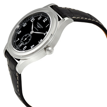 Stainless steel case with a black alligator leather strap. Fixed stainless steel bezel. Black dial with silver-tone hands and Arabic numeral hour markers. Minute markers around the outer rim. Dial Type: Analog. Date display at the 6 o'clock position. Seconds sub-dial at the 6 o'clock position. Longines calibre 615 automatic movement with a 42-hour power reserve. Scratch resistant sapphire crystal. Transparent case back. Case size: 38.5 mm. Round case shape. Tang clasp. Water resistant at 30 meters / 100 feet. Functions: date, hour, minute, second. Luxury watch style. Watch label: Swiss Made. Longines Heritage Automatic Black Dial Men's Watch L2.767.4.53.2.