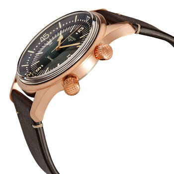 Bronze case with a brown (calfskin) leather strap. Bi-directional rotating bronze bezel. Green dial with luminous rose gold-tone hands and index hour markers. Arabic numerals appear at the 3, 6, 9 and 12 o'clock positions. Minute markers around the outer rim. Dial Type: Analog. Luminescent hands and markers. Date display at the 3 o'clock position. Longines calibre L888 automatic movement, based upon ETA A31.L11, containing 21 Jewels, bitting at 25200 vph, and has a power reserve of approximately 64 hours. Scratch resistant sapphire crystal. Screw down crown. Solid case back. Round case shape. Case size: 42 mm. Band width: 22 mm. Tang clasp. Water resistant at 300 meters / 1000 feet. Functions: hour, minute, second. Heritage Series. Dress watch style. Watch label: Swiss Made. Longines Heritage Automatic Green Dial Men's Watch L3.774.1.50.2.