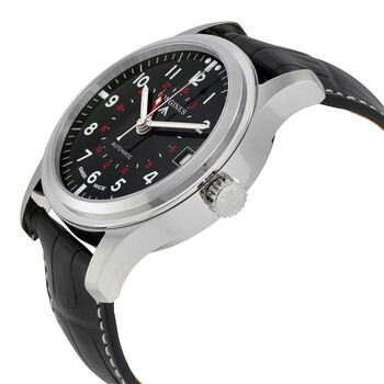 Stainless steel case with a black leather strap. Fixed stainless steel bezel. Black dial with luminous silver-tone hands and Arabic numeral hour markers. 24 hour (GMT) markers. Minute markers around the outer rim. Dial Type: Analog. Luminescent hands and markers. Date display at the 3 o'clock position. Longines calibre L704.2 automatic movement with a 48-hour power reserve. Scratch resistant sapphire crystal. Pull / push crown. Solid case back. Case diameter: 44 mm. Case thickness: 15 mm. Round case shape. Tang clasp. Water resistant at 30 meters / 100 feet. Functions: date, hour, minute, second. Luxury watch style. Watch label: Swiss Made. Longines Heritage Avigation Automatic Black Dial Black Leather Men's Watch L28314532.