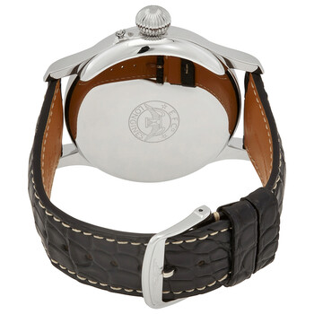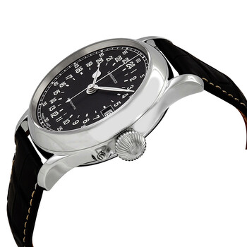 Stainless steel case with a black leather strap. Fixed stainless steel bezel. Black dial with silver-tone hands and Arabic numeral hour markers. 24 hour markers. Minute markers around the outer rim. Dial Type: Analog. Date display at the 3 o'clock position. Longines calibre L704.3 automatic movement with a 48-hour power reserve. Scratch resistant sapphire crystal. Push / pull crown. Transparent case back. Round case shape. Case size: 47.5 mm. Case thickness: 16.15 mm. Band width: 18 mm. Tang clasp. Water resistant at 30 meters / 100 feet. Functions: date, hour, minute, second. Casual watch style. Watch label: Swiss Made. Longines Heritage Avigation Automatic Black Dial Men's Watch L2.751.4.53.4.