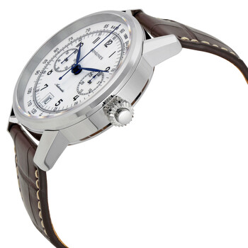 Stainless steel case with a brown (alligator) leather strap. Fixed stainless steel bezel. White dial with blue hands hands and Arabic numeral hour markers. Minute markers. Tachymeter markings around the outer rim. Dial Type: Analog. Date display at the 6 o'clock position. Chronograph - two sub-dials displaying: 60 second and 30 minute. Longines calibre L788 automatic movement with a 54-hour power reserve. Scratch resistant sapphire crystal. Pull / push crown. Transparent case back. Case size: 41 mm. Case thickness: 14 mm. Round case shape. Strap width: 20 mm. Tang clasp. Water resistant at 30 meters / 100 feet. Functions: chronograph, tachymeter, date, hour, minute, second. Casual watch style. Longines Heritage Collection Chronograph Automatic Men's Watch L2.800.4.23.2.
