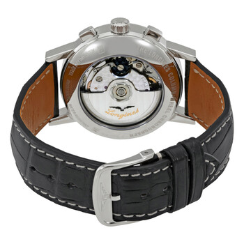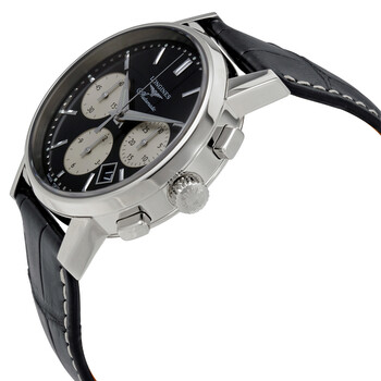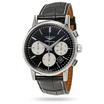 Stainless steel case with a black leather strap. Fixed stainless steel bezel. Black dial with silver-tone hands and index hour markers. Minute markers around the outer rim. Dial Type: Analog. Date display between the 4 and 5 o'clock positions. Chronograph - three sub-dials displaying: 60 second, 30 minute and 1/10th of a second. Longines calibre 688 automatic movement with a 54-hour power reserve. Scratch resistant sapphire crystal. Transparent case back. Case size: 39 mm. Round case shape. Tang clasp. Water resistant at 30 meters / 100 feet. Functions: chronograph, date, hour, minute, second. Luxury watch style. Watch label: Swiss Made. Longines Heritage Column Wheel Chronograph Automatic Men's Watch L27334920.
