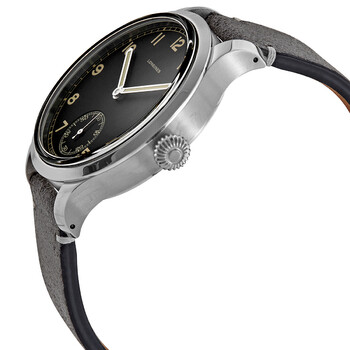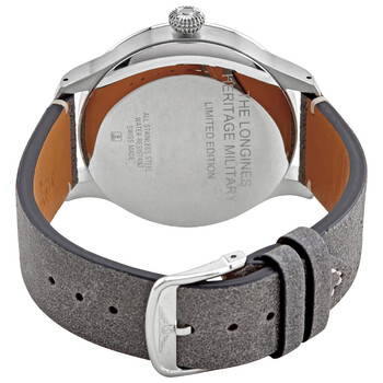 Stainless steel case with a anthracite (calfskin) leather strap. Fixed stainless steel bezel. Black dial with luminous silver-tone hands and Arabic numeral hour markers. Minute markers around the outer rim. Dial Type: Analog. Luminescent hands and markers. One subdial displaying: small seconds. Longines Calibre L507 hand wind movement with a 46-hour power reserve. Scratch resistant sapphire crystal. Pull / push crown. Solid case back. Round case shape, case size: 43 mm. Band width: 20 mm. Tang clasp. Water resistant at 30 meters / 100 feet. Functions: hour, minute, second. Additional Info: limited edition. Heritage Military Series. Luxury watch style. Watch label: Swiss Made. Longines Heritage Military Hand Wind Black Dial Men's Watch L2.826.4.53.2.