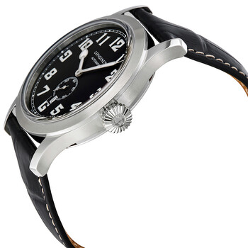 Stainless steel case with a black leather strap. Fixed stainless steel bezel. Black dial with luminous hands and Arabic numeral hour markers. Minute markers around the outer rim. Dial Type: Analog. Date display at the 6 o'clock position. Small seconds sub-dial. Longines calibre L615 automatic movement with a 42-hour power reserve. Scratch resistant sapphire crystal. Solid case back. Round case shape. Case size: 44 mm. Band width: 25 mm. Tang clasp. Water resistant at 30 meters / 100 feet. Functions: date, hour, minute, second. Luxury watch style. Watch label: Swiss Made. Longines Heritage Miltary Automatic Black Leather Men's Watch L28114530.