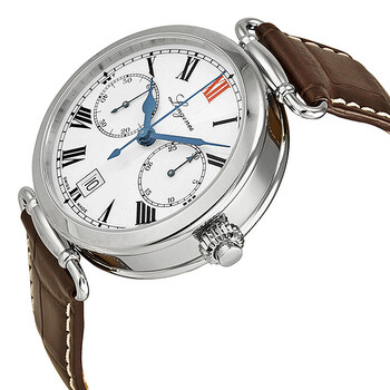 Stainless steel case with a brown crocodile leather strap. Fixed stainless steel bezel. White dial with blue hands and Roman numeral hour markers. Minute markers around the outer rim. Dial Type: Analog. Date display at the 6 o'clock position. Chronograph - two sub-dials displaying: 60 second and 30 minute. Longines Calibre L788 automatic movement with about 54 hours of power reserve. Scratch resistant sapphire crystal. Pull / push crown. Skeleton case back. Case size: 40 mm. Case thickness: 14 mm. Round case shape. Tang clasp. Water resistant at 30 meters / 100 feet. Functions: chronograph, column wheel, monopoussoir, date, hour, minute, small second. Dress watch style. Watch label: Swiss Made. Longines Heritage White Dial Brown Leather Men's Watch L27764213.