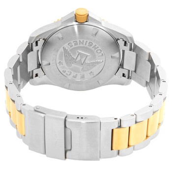 Stainless steel case with a stainless steel bracelet with 18kt yellow gold center links. Uni-directional rotating 18kt yellow gold bezel with an inlaid green ceramic ring. Green dial with luminous yellow gold-tone hands and dot hour markers. Arabic numerals appear at the 6, 9 and 12 o'clock positions. Minute markers around the outer rim. Dial Type: Analog. Luminescent hands and markers. Date display at the 3 o'clock position. Longines calibre L888 automatic movement, based upon ETA A31.L11, containing 21 Jewels, bitting at 25200 vph, and has a power reserve of approximately 64 hours. Scratch resistant sapphire crystal. Screw down crown. Solid case back. Round case shape. Case size: 41 mm. Case thickness: 11.9 mm. Band width: 21 mm. Fold over clasp. Water resistant at 300 meters / 1000 feet. Functions: date, hour, minute, second. Additional Info: original box, manual (complete accessories). Hydro Conquest Series. Luxury watch style. Watch label: Swiss Made. Longines Hydro Conquest Automatic Green Dial Men's Watch L3.781.3.06.7.