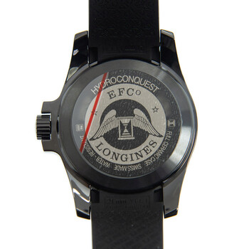 Black ceramic case with a black rubber strap. Uni-directional rotating ceramic bezel. Black dial with Arabic numeral hour markers. Minute markers around the outer rim. Dial Type: Analog. Luminescent hands and markers. Date display at the 3 o'clock position. Longines calibre L619/888 automatic movement, based upon ETA 2892, containing 21 Jewels, bitting at 25200 vph, and has a power reserve of approximately 64 hours. Scratch resistant sapphire crystal. Screw down crown. Solid case back. Round case shape. Case size: 43 mm. Strap width: 21 mm. Fold over clasp. Water resistant at 300 meters / 1000 feet. Functions: date, hour, minute, second. Hydroconquest Series. Dive watch style. Watch label: Swiss Made. Longines Hydroconquest Automatic All Black Ceramic Men's 43mm Watch L37844569.