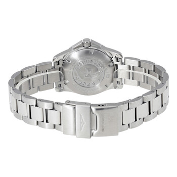 Stainless steel case with a stainless steel bracelet. Uni-directional rotating stainless steel bezel with an inlaid black ion-plated (count-up elapsed time) ring. Black dial with luminous silver-tone snowflake-shape hands and white index hour markers. Arabic numerals mark the 6, 9 and 12 o'clock positions. Minute markers around outer rim. Dial Type: Analog. Luminescent hands and markers. Date display at the 3 o'clock position. Longines calibre L595/592 automatic movement, based upon ETA 2000-1, containing 20 Jewels, bitting at 28800 vph, and has a power reserve of approximately 40 hours. Scratch resistant sapphire crystal. Screw down crown. Screw down case back. Round case shape. Case size: 29.5 mm. Case thickness: 8 mm. Band width: 15 mm. Band length: 6 inches. Deployment clasp. Water resistant at 300 meters / 1000 feet. Functions: date, hour, minute, second. Hydroconquest Series. Dive watch style. Watch label: Swiss Made. Item Variations: L3 284 4 56 6, L3-284-4-56-6, L3/284/4/56/6, L32844566. Longines HydroConquest Automatic Black Dial Ladies Watch L328445.