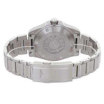 Silver-tone stainless steel case and bracelet. Uni-directional rotating black ceramic bezel. Black dial with silver-tone hands and index hour markers. Minute markers around the outer rim. Dial Type: Analog. Luminescent hands and markers. Date display at the 3 o'clock position. Longines Calibre L844 automatic movement with a 72-hour power reserve. Scratch resistant sapphire crystal. Screw down crown. Solid case back. Round case shape, case size: 41 mm. Fold over clasp with a safety release. Water resistant at 300 meters / 1000 feet. Functions: date, hour, minute, second. Additional Info: original box, international warranty card, manual (complete accessories). Hydroconquest Series. Dive watch style. Watch label: Swiss Made. Longines Hydroconquest Automatic Black Dial Men's Watch L3.790.4.56.6.