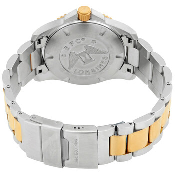 Stainless steel case with a two-tone (silver-tone and yellow gold PVD) stainless steel bracelet. Uni-directional rotating yellow gold PVD bezel with an inlaid blue ceramic ring. Blue dial with luminous yellow gold-tone hands and dot hour markers. Arabic numerals appear at the 6, 9 and 12 o'clock positions. Minute markers around the outer rim. Dial Type: Analog. Luminescent hands and markers. Date display at the 3 o'clock position. Longines calibre L888 automatic movement, based upon ETA A31.L11, containing 21 Jewels, bitting at 25200 vph, and has a power reserve of approximately 64 hours. Scratch resistant sapphire crystal. Screw down crown. Solid case back. Round case shape. Case size: 41 mm. Case thickness: 11.9 mm. Band width: 21 mm. Fold over clasp. Water resistant at 300 meters / 1000 feet. Functions: date, hour, minute, second. Additional Info: original box, manual (complete accessories). Hydroconquest Series. Luxury watch style. Watch label: Swiss Made. Longines HydroConquest Automatic Blue Dial Men's Watch L3.781.3.96.7.