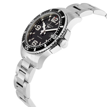 Stainless steel case with a stainless steel bracelet. Unidirectional rotating stainless steel bezel with black aluminum top ring. Black dial with luminous hands and dot hour markers. Arabic numerals mark the 6, 9 and 12 o'clock positions. Minute markers around the outer rim. Dial Type: Analog. Luminescent hands and dial markers. Date displays at the 3 o'clock position. Quartz movement. Scratch resistant sapphire crystal. Screw down crown. Solid case back. Case diameter: 39 mm. Case thickness: 10.2 mm. Round case shape. Band width: 20.3 mm. Band length: 8.5 inches. Double security folding clasp. Water resistant at 300 meters (1000 feet). Functions: hours/ minutes/ seconds/ date. Sport watch style. Watch label: Swiss Made. Longines HydroConquest Black Dial Stainless Steel Men's Watch L36404566.
