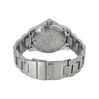 Stainless steel case with a stainless steel bracelet. Uni-directional rotating stainless steel bezel with black top ring. Black dial with luminous silver-tone hands and Arabic numeral hour markers. Minute markers around the outer rim. Dial Type: Analog. Luminescent hands and markers. Date display at the 3 o'clock position. Automatic movement. Scratch resistant sapphire crystal. Solid case back. Case diameter: 41 mm. Case thickness: 10.2 mm. Round case shape. Fold over deployment clasp. Water resistant at 300 meters / 1000 feet. Functions: date, hour, minute, second. Dress watch style. Longines HydroConquest Black Dial Stainless Steel Men's Watch L36954536.