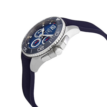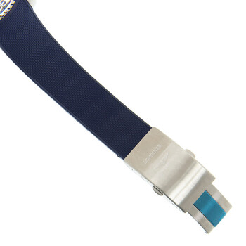 Stainless steel case with a blue rubber strap. Uni-directional rotating stainless steel bezel with a blue ceramic ring. Blue dial with luminous silver-tone hands and dot hour markers. An Arabic numeral appears at the 12 o'clock position. Minute markers around the outer rim. Dial Type: Analog. Luminescent hands and markers. Date display at the 4 o'clock position. Chronograph - three sub-dials displaying: 60 second, 30 minute and 12 hour. Longines calibre L688 automatic movement, based upon ETA A08.L01, containing 27 Jewels, bitting at 28800 vph, and has a power reserve of approximately 54 hours. Scratch resistant sapphire crystal. Screw down crown. Solid case back. Round case shape. Case size: 43 mm. Band width: 22 mm. Fold over clasp. Water resistant at 300 meters / 1000 feet. Functions: chronograph, column wheel, date, hour, minute, small second. Hydroconquest Series. Dive watch style. Watch label: Swiss Made. Longines HydroConquest Chronograph Automatic Blue Dial Men's Watch L38834969.