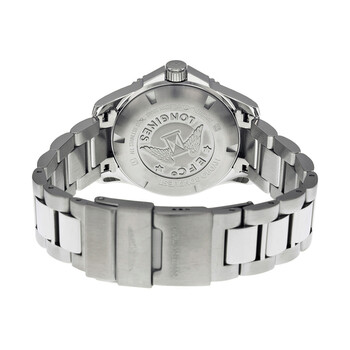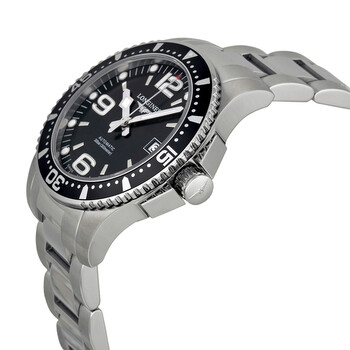 Stainless steel case with a stainless steel bracelet. Unidirectional rotating stainless steel bezel with a black top ring. Black dial with luminous silver-tone hands and index hour markers. Arabic numerals mark the 6, 9, and 12 o'clock position. Minute markers around the outer rim. Dial Type: Analog. Luminescent hands and markers. Date displays at the 3 o'clock position. Longines calibre L633 automatic movement with a 38-hour power reserve. Scratch resistant sapphire crystal. Protected screw down crown. Screw down case back. Case diameter: 39 mm. Case thickness: 11.8 mm. Round case shape. Band width: 19 mm. Band length: 8 inches. Double locking clasp. Water resistant at 300 meters/ 1000 feet. Functions: hours, minutes, seconds, date. Sport watch style. Watch label: Swiss Made. Item Variations: L3 641 4 56 6, L3-641-4-56-6, L3/641/4/56/6, L36414566. Longines Hydroconquest Sport Black Dial Stainless Steel Men's Watch L3.641.4.56.6.
