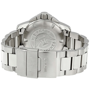Stainless steel case with a stainless steel link bracelet. Uni-directional rotating stainless steel bezel. Grey dial with luminous hands and dot hour markers. Large Arabic numeral marks the 12 o'clock position. Minute markers around the outer rim. Luminescent hands and markers. Date display appears at the 3 o'clock position. Chronograph - three sub-dials displaying: 60 seconds, 30 minutes and 12 hours. Automatic movement. Scratch resistant sapphire crystal. Textured steel crown. Solid case back. Case diameter: 41 mm. Case thickness: 15.8 mm. Double locking fold over clasp. Water resistant at 300 meters / 1000 feet. Functions: hours, minutes, small seconds at 9 o'clock. Chronograph mechanism. Longines HydroConquest Swiss Chronograph Men's Watch L36734766.