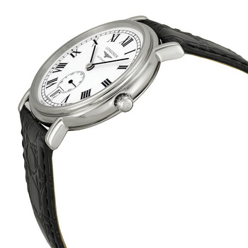Stainless steel case with a leather strap. Fixed stainless steel bezel. White dial with black hands and Roman numeral hour markers. Minute markers around the outer rim. Dial Type: Analog. Date display at the 6 o'clock position. Seconds sub-dial at the 6 o'clock position. Automatic movement. Scratch resistant sapphire crystal. Pull / push crown. Skeleton case back. Case diameter: 34 mm. Round case shape. Tang clasp. Water resistant at 30 meters / 100 feet. Functions: date, hour, minute, second. Dress watch style. Longines La Grand Classic Presence White Dial Black Leather Watch L48044112.