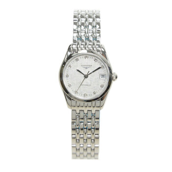 Silver-tone stainless steel case and bracelet. Fixed silver-tone stainless steel bezel. Silver-tone dial with silver-tone hands and diamond hour markers. Minute markers around the outer rim. Dial Type: Analog. Date display at the 3 o'clock position. Longines Calibre L595 Automatic movement, based upon ETA 2000/1, containing 20 Jewels, bitting at 28800 vph, and has a power reserve of approximately 40 hours. Scratch resistant sapphire crystal. Transparent see through case back. Round case shape, case size: 25 mm. Fold over clasp with a safety release. Functions: date, hour, minute, second. La Grande Series. Luxury watch style. Watch label: Swiss Made. Longines La Grande Automatic Diamond Silver Dial Ladies Watch L4.398.4.77.6.