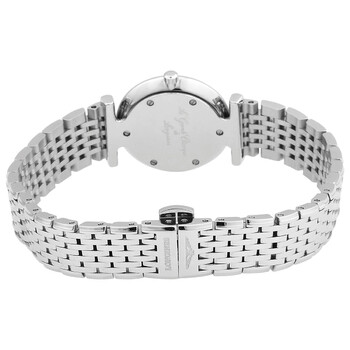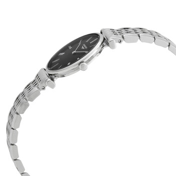 Stainless steel case with a stainless steel bracelet. Fixed stainless steel bezel. Black dial with silver-tone hands and Roman numeral hour markers. Dial Type: Analog. Longines Calibre L209 quartz movement. Scratch resistant sapphire crystal. Pull / push crown. Solid case back. Round case shape. Case size: 24 mm. Case thickness: 4.3 mm. Band width: 13 mm. Fold over clasp. Water resistant at 30 meters / 100 feet. Functions: hour, minute. La Grande Series. Luxury watch style. Watch label: Swiss. Longines La Grande Black Dial Stainless Steel Unisex Watch L42094516.