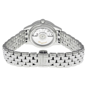 Stainless steel case with a stainless steel bracelet. Fixed silver-tone bezel set with diamonds. Black dial with silver-tone hands and diamond hour markers. Dial Type: Analog. Date display at the 3 o'clock position. Automatic movement. Scratch resistant sapphire crystal. Pull / push crown. Skeleton case back. Case diameter: 26 mm. Round case shape. Deployment clasp with push button. Water resistant at 30 meters / 100 feet. Functions: date, hour, minute, second. Dress watch style. Watch label: Swiss Made. Longines La Grande Classique Automatic Diamond Black Dial Stainless Steel Ladies Watch L42740576.