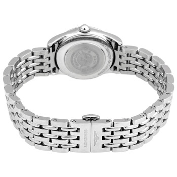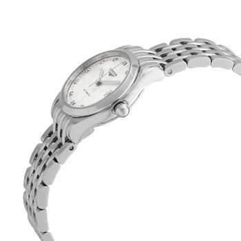 Silver-tone stainless steel case and bracelet. Fixed silver-tone stainless steel bezel. Silver dial with silver-tone hands and diamond hour markers. Minute markers around the outer rim. Dial Type: Analog. Date display at the 3 o'clock position. Automatic movement with a 40-hour power reserve. Scratch resistant sapphire crystal. Pull / push crown. Solid case back. Round case shape, case size: 25 mm, case thickness: 8 mm. Band width: 14 mm. Deployment clasp. Water resistant at 30 meters / 100 feet. Functions: date, hour, minute, second. La Grande Classique Series. Dress watch style. Watch label: Swiss. Longines La Grande Classique Automatic Diamond Silver Dial Ladies Watch L4.298.4.77.6.