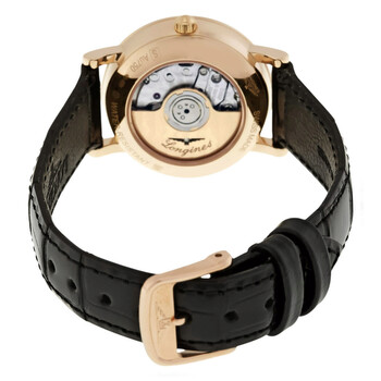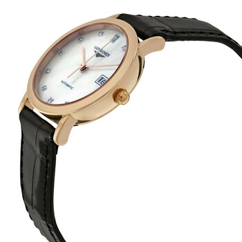 18kt rose gold case with a black alligator leather strap. Fixed 18kt rose gold bezel. Mother of pearl dial with rose gold-tone hands and diamond hour markers. Dial Type: Analog. Date display at the 3 o'clock position. Longines Calibre L595/592 Automatic movement, based upon ETA 2000-1, containing 20 Jewels, bitting at 28800 vph, and has a power reserve of approximately 40 hours. Scratch resistant sapphire crystal. Pull / push crown. Transparent case back. Round case shape, case size: 27.3 mm. Band width: 14 mm. Tang clasp. Water resistant at 30 meters / 100 feet. Functions: date, hour, minute, second. La Grande Classique Series. Dress watch style. Watch label: Swiss Made. Longines La Grande Classique Automatic Ladies Watch L43788870.