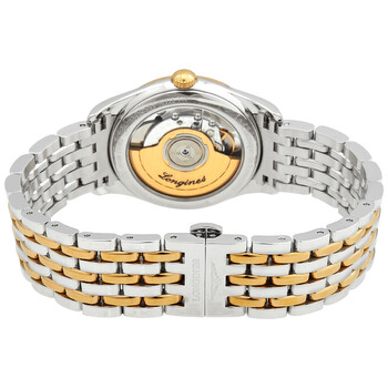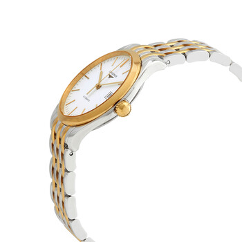 Yellow gold-tone stainless steel PVD case with a two-tone (silver-tone and gold-tone) stainless steel bracelet. Fixed gold-tone stainless steel PVD bezel. White dial with gold-tone hands and index hour markers. Minute markers around the outer rim. Dial Type: Analog. Date display at the 3 o'clock position. Longines Calibre L619 Automatic movement, based upon ETA 2892-A2, containing 21 Jewels, bitting at 28800 vph, and has a power reserve of approximately 42 hours. Scratch resistant sapphire crystal. Round case shape, case size: 36 mm. Band width: 18 mm. Functions: date, hour, minute, second. La Grande Classique Series. Casual watch style. Watch label: Swiss Made. Longines La Grande Classique Automatic White Dial Watch L4.898.3.12.7.